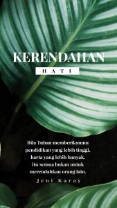 Ingat selalu bahwa semua yang diberikan lebih bukan untuk mengurangi atau merendahkan orang lain. Hidup penuh kerendahan hati akan slalu membuatmu diterima dan dikasihi oleh siapapun yang kamu temui. Hidup dalam kesombongan? Siap-siap deh bakal dihajar dengan kehidupan.