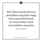 Saya percaya bahwa manusia diberikan lebih banyak dalam segala hal bukan untuk merendahkan orang lain. Bila Tuhan memberikanmu pendidikan yang lebih tinggi, harta yang lebih banyak, itu semua bukan untuk merendahkan orang lain. Kita, manusia, adalah makhluk sosial. Manusia yang diciptakan untuk bisa hidup bersama orang lain. Artinya kita pun harus peduli dengan orang lain bukan makin memurukkan orang lain dengan apa yang kita miliki.