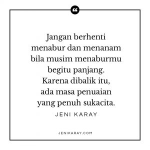 Tapi waktu menuai tiba, kamu akan menikmati betapa manisnya sebuah pengorbanan, betapa indahnya sebuah penantian, betapa puasnya menjaga sebuah benih hingga berubah menjadi buah yang bisa dinikmati.